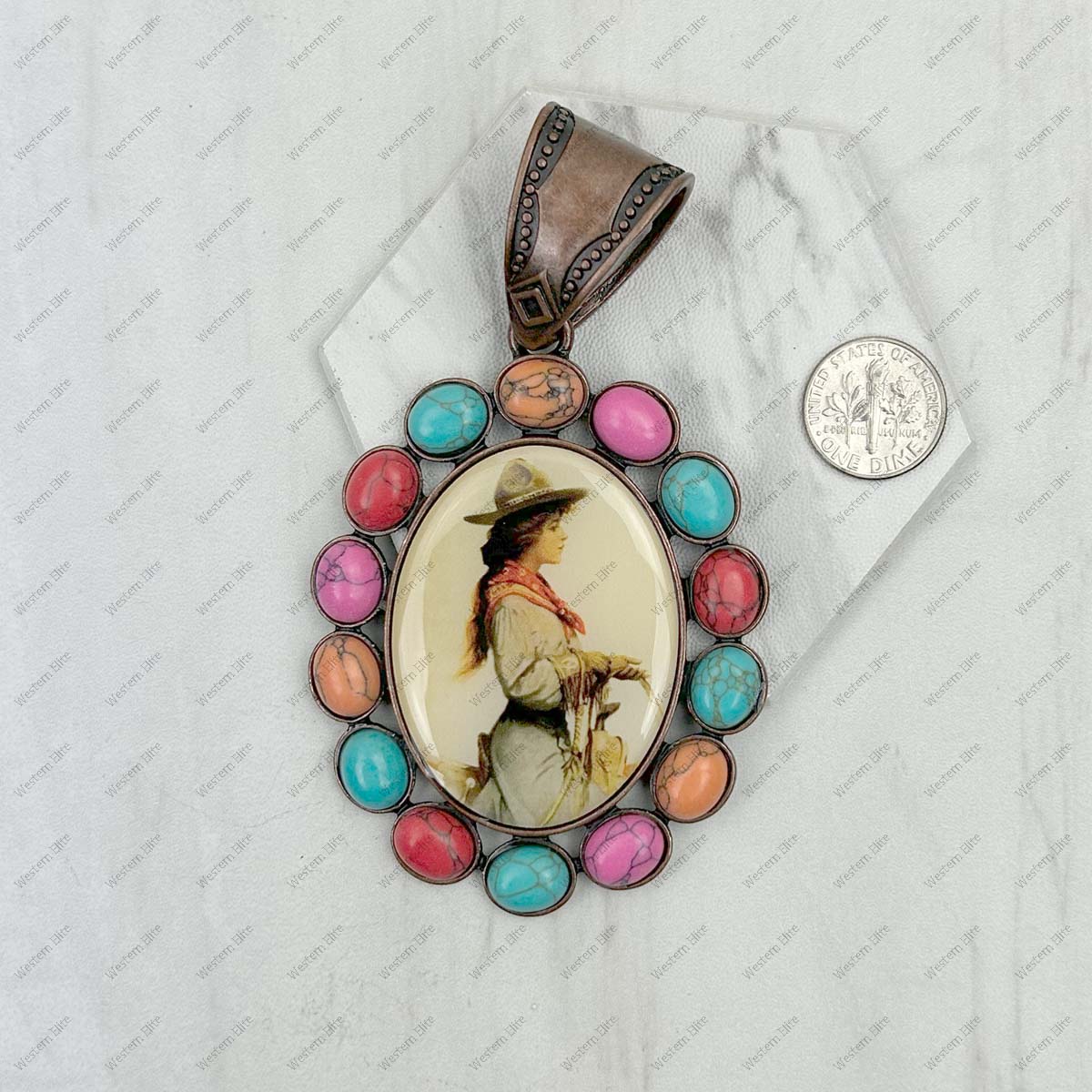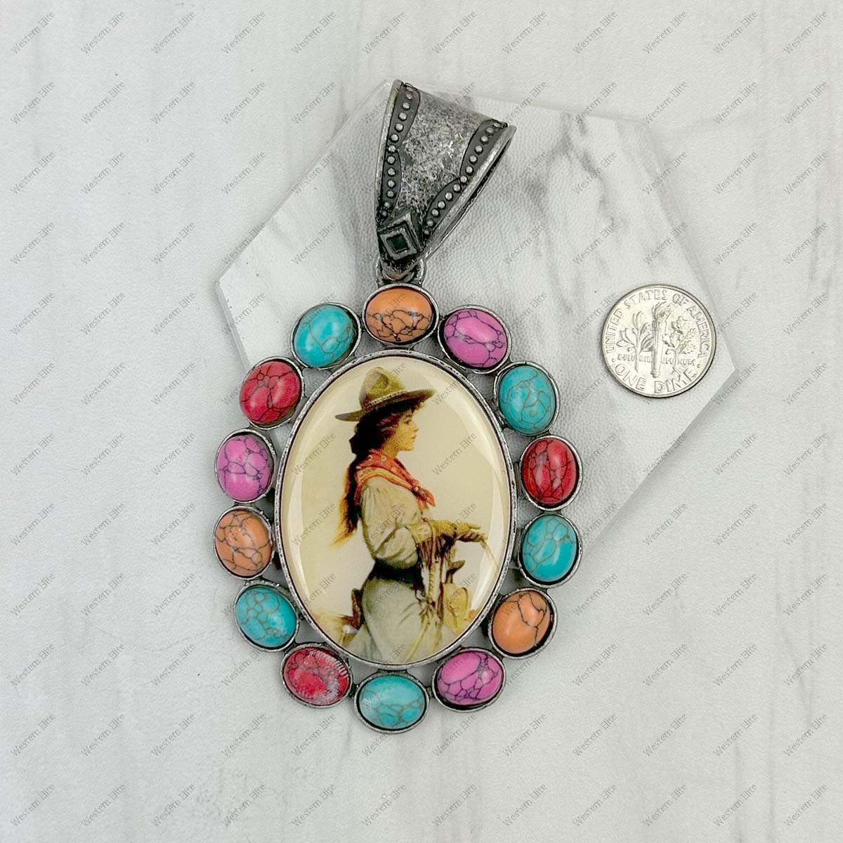 PD231210SL-61 silver metal with muti stone oval cowgirl Pendent
