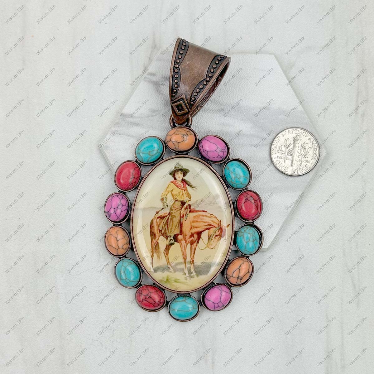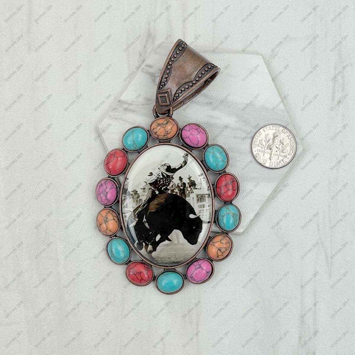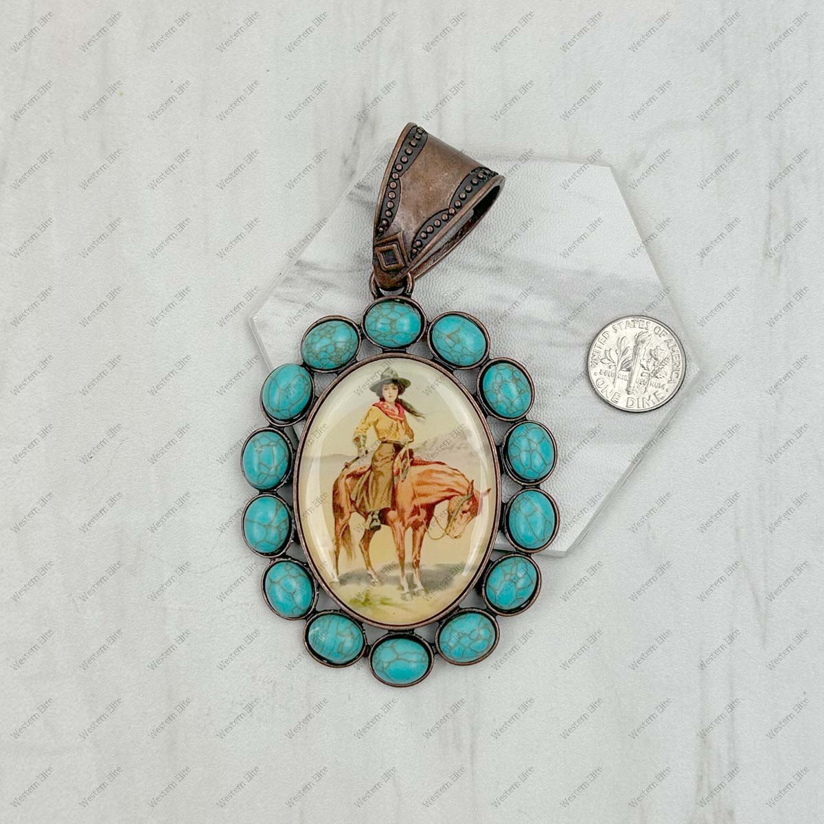 PD231210CP-33 Copper metal with blue turquoise stone oval cowboy Pendent