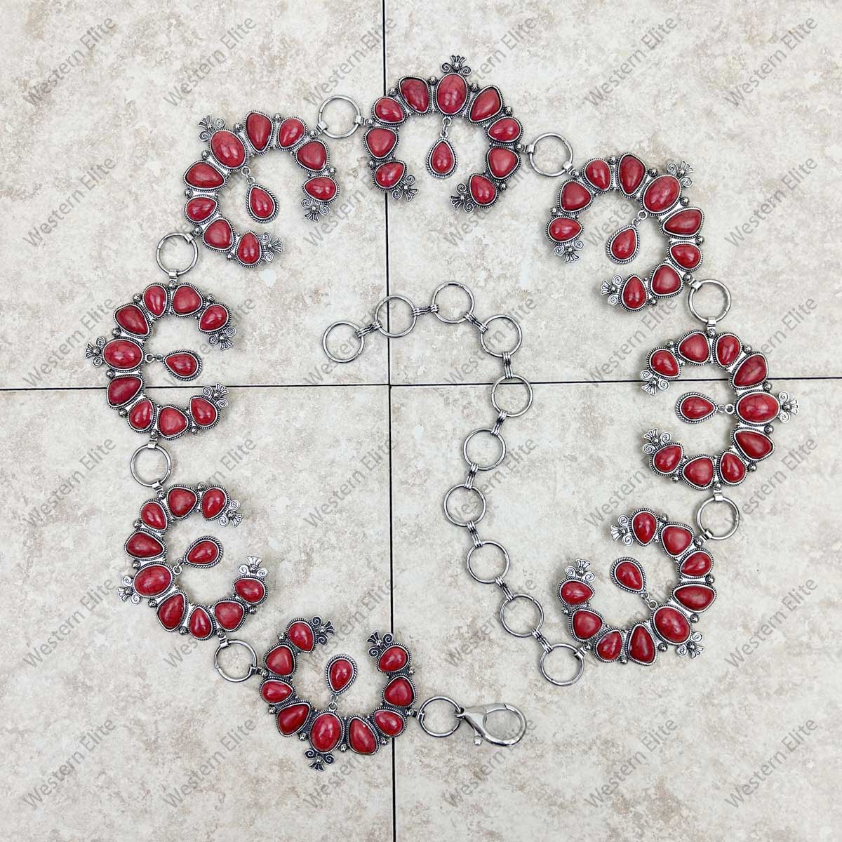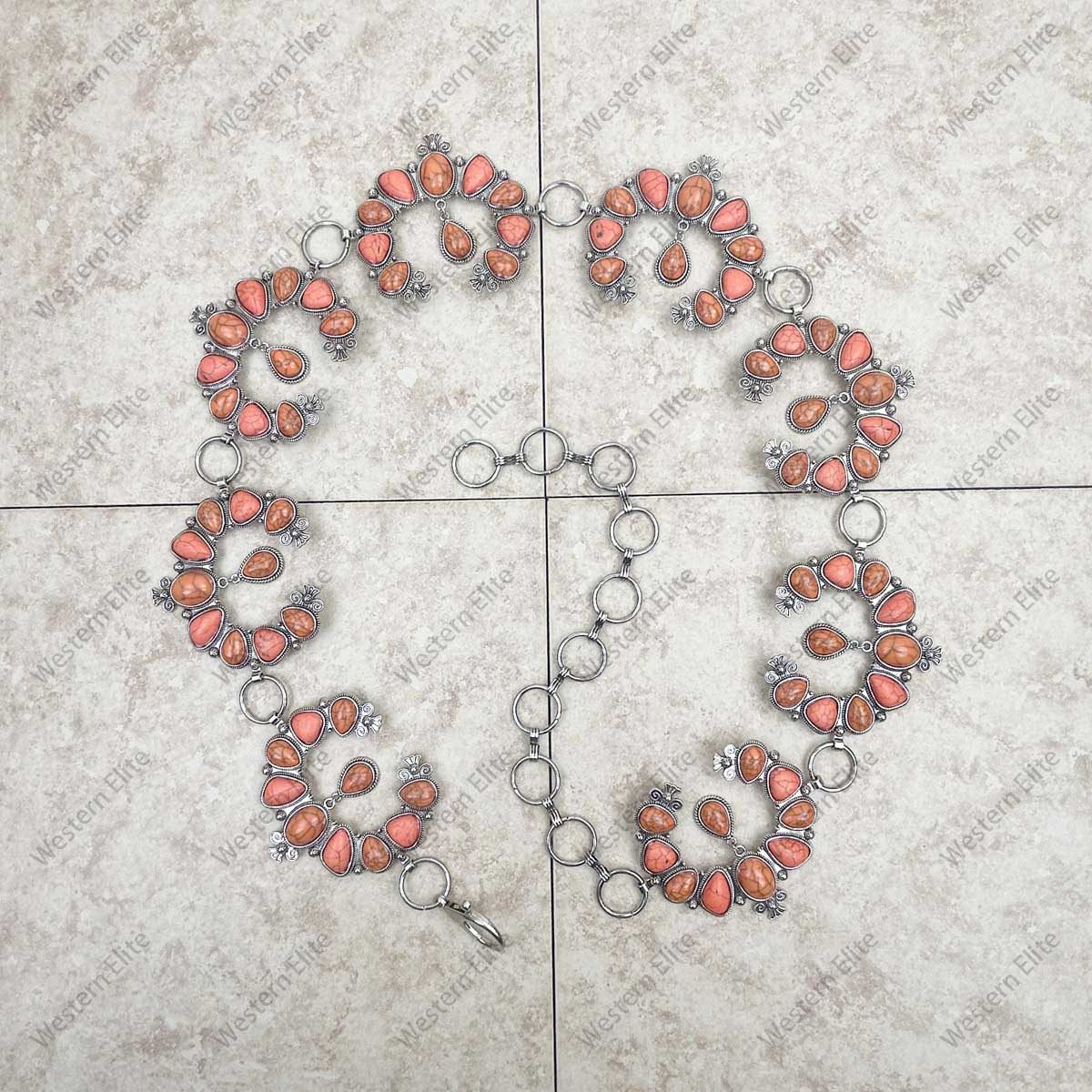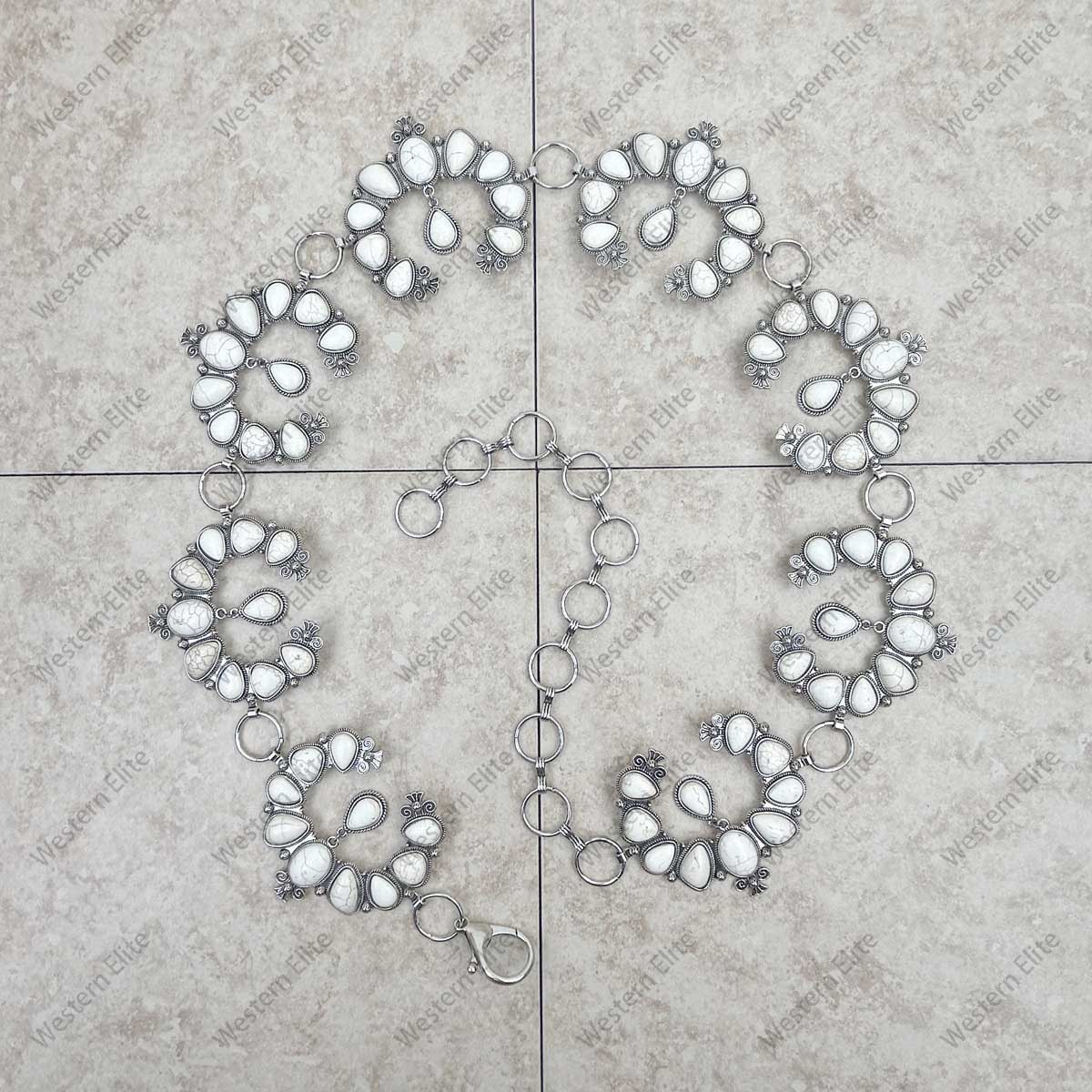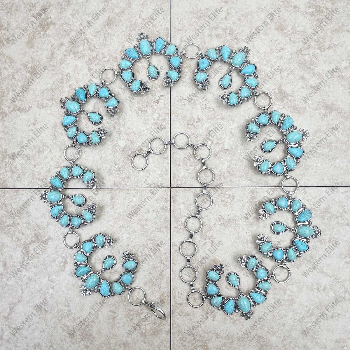 31 inches silver metal with blue turquoise stone squash blossom link chain belt