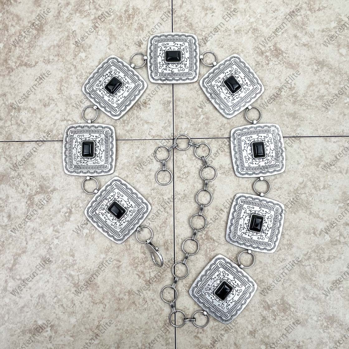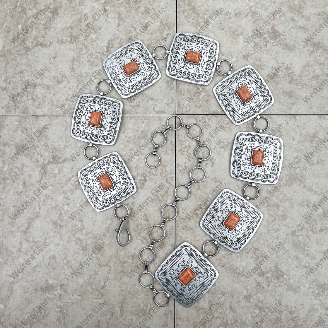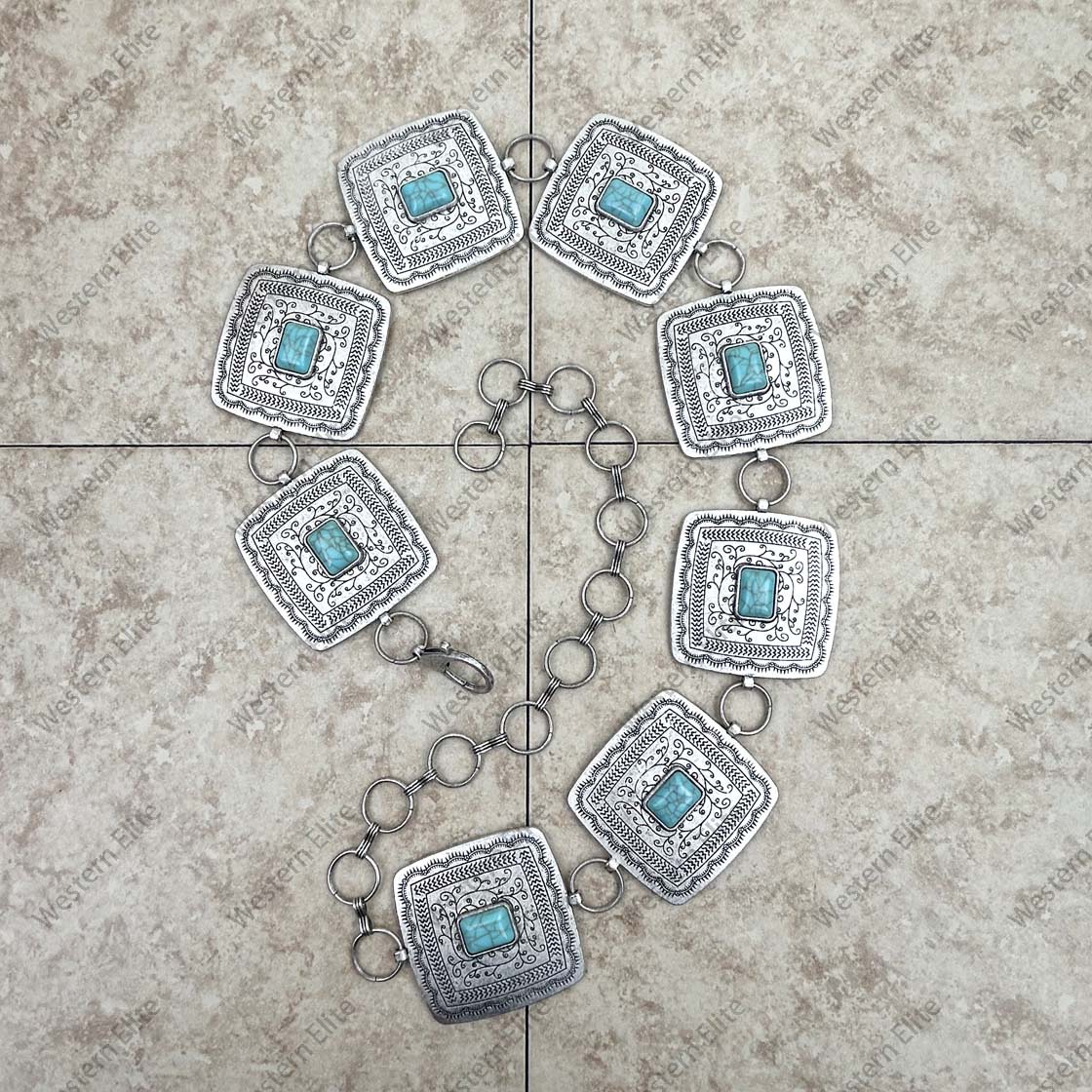 28 inches silver metal with blue turquoise stone square link chain belt