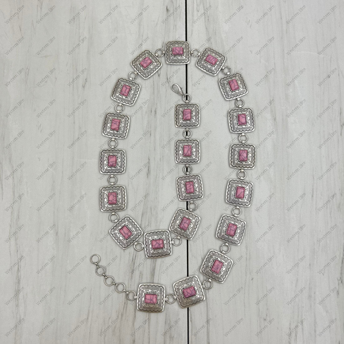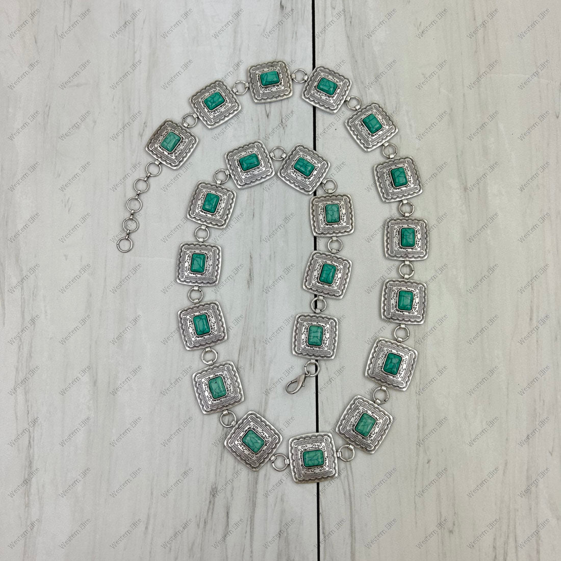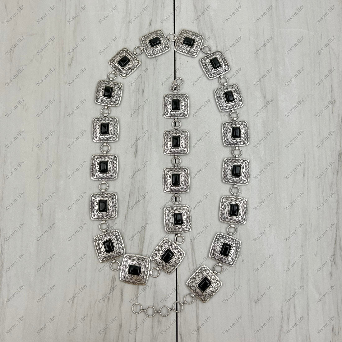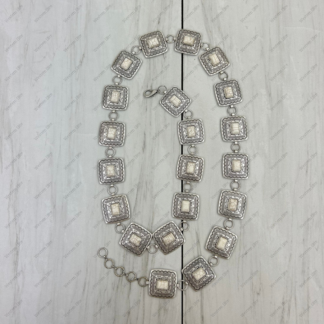 BLT220630-07-WHITE 40 Inches long silver metal square with white stone adjustable chain belt