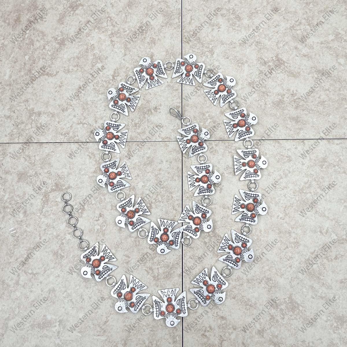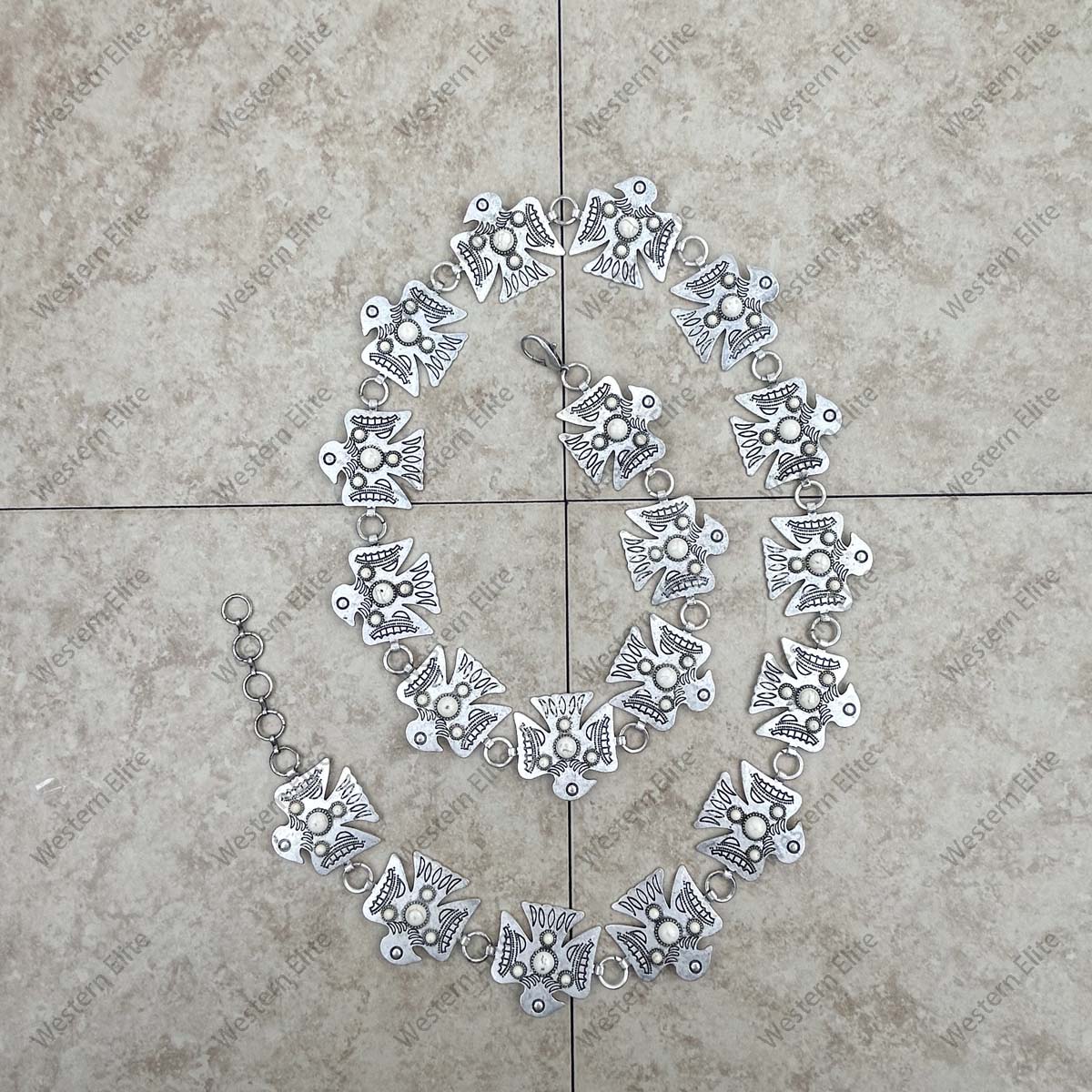 | 39 Inches long silver metal with blue turquoise stone eagles adjustable chain belt Extension: 3 inches long |