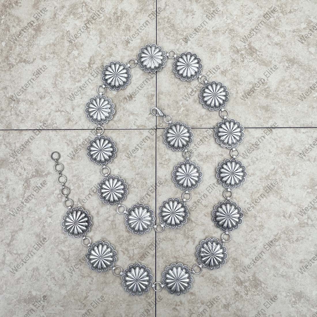 BLT230225-02-SILVER 39 Inches long silver metal flower conchos adjustable chain belt