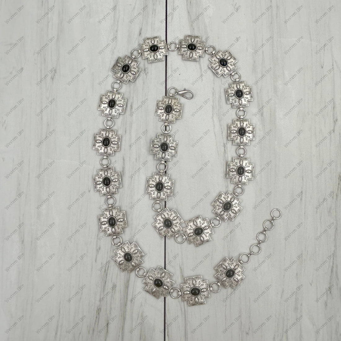 38 inches silver metal with blue turquoise stone cross link chain belt + 3 inches extension