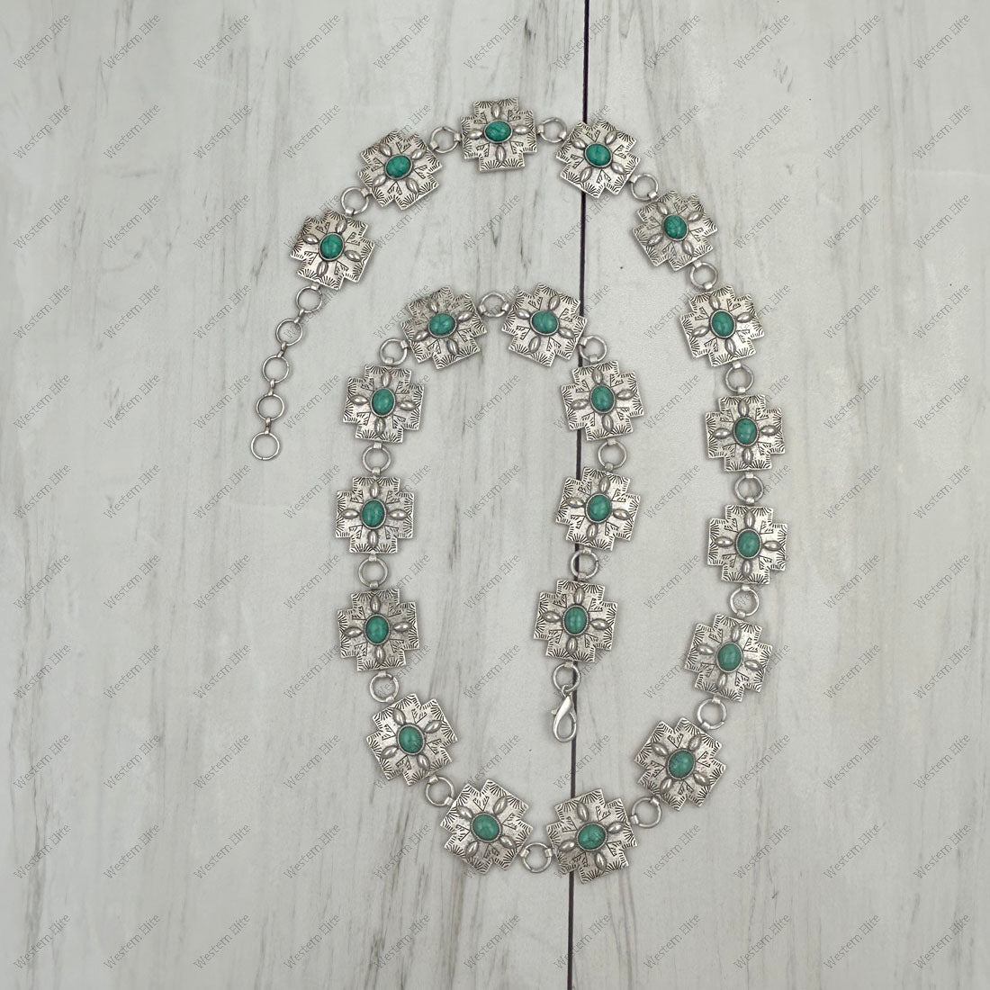 38 inches silver metal with blue turquoise stone cross link chain belt