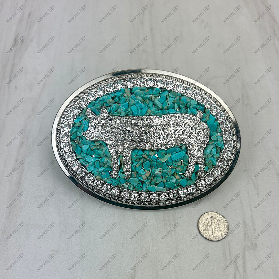 BKE-PIG-CLEAR Silver metal with blue turquoise stone chips clear crystal pig Belt buckle