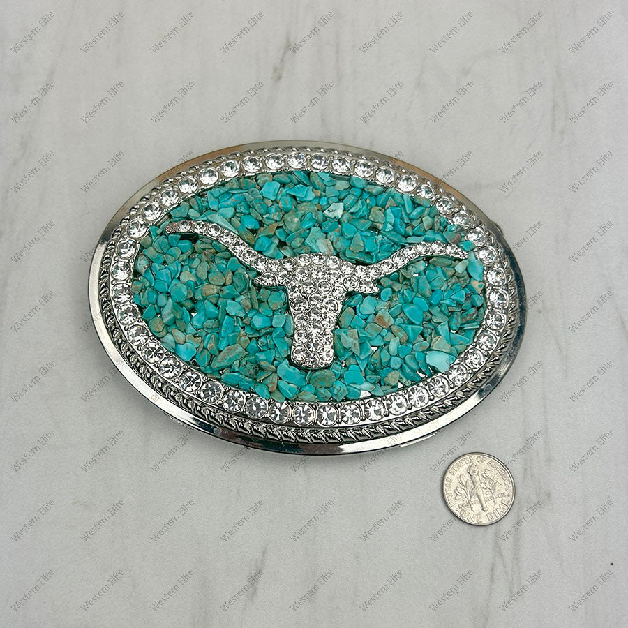 BKE-LONEHORN-CLEAR Silver metal with blue turquoise stone chips Longhorn Belt buckle