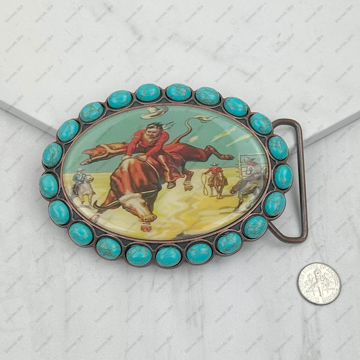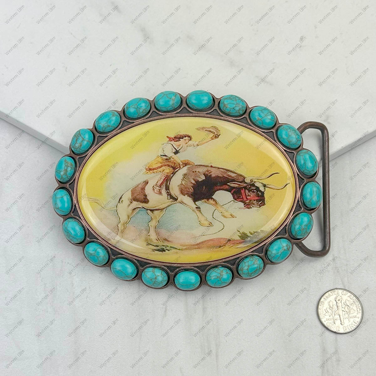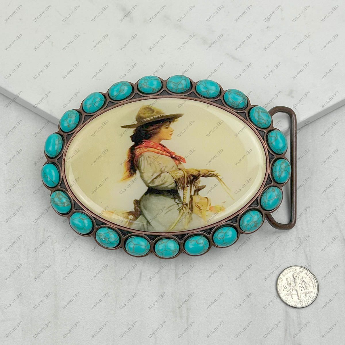 BUK240213-23 Oval copper metal with blue turquoise stone and cowgirl Belt buckle