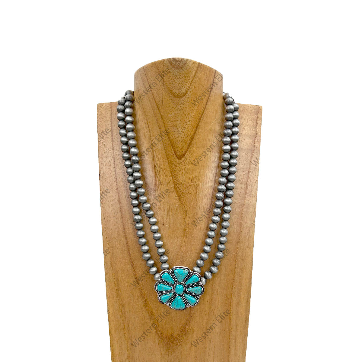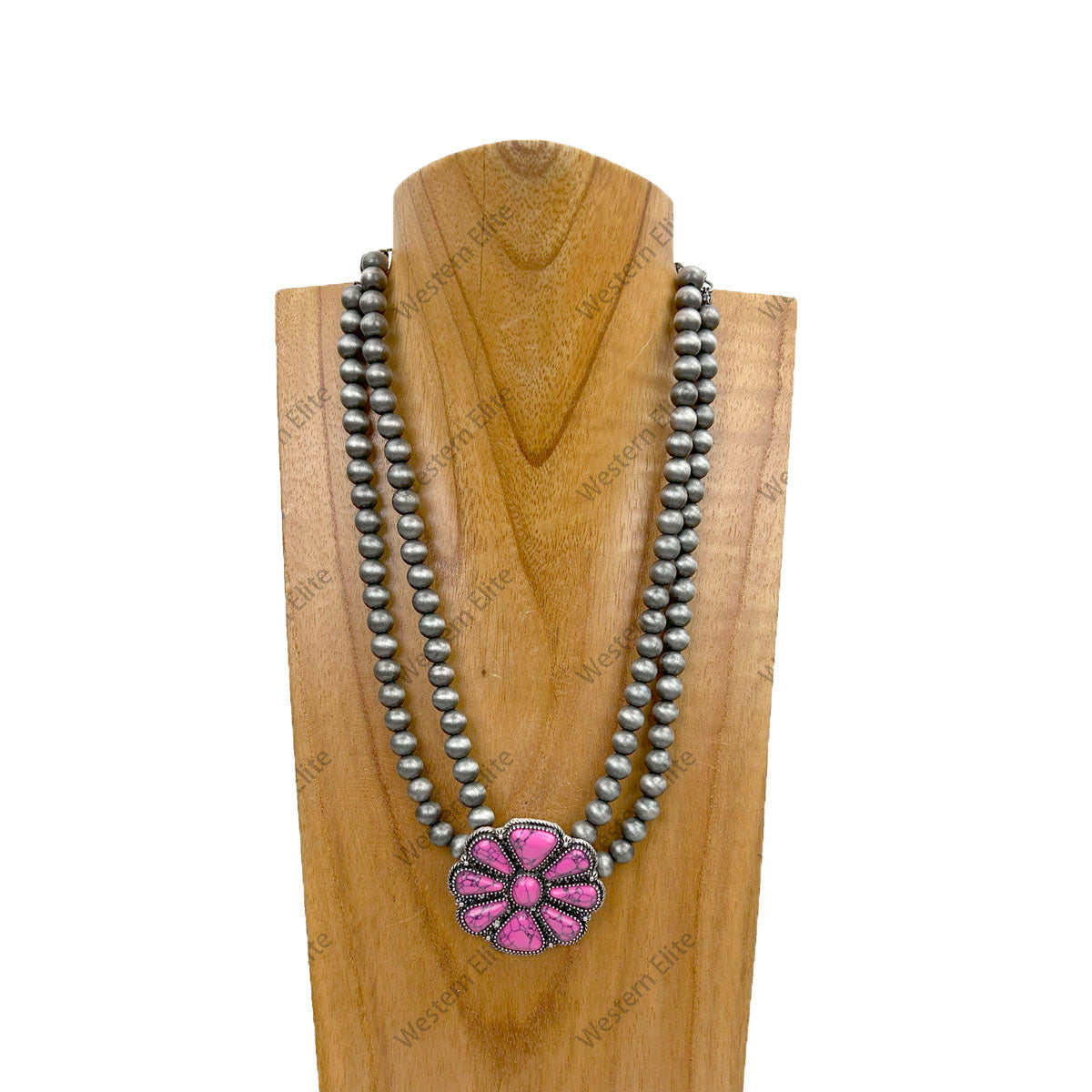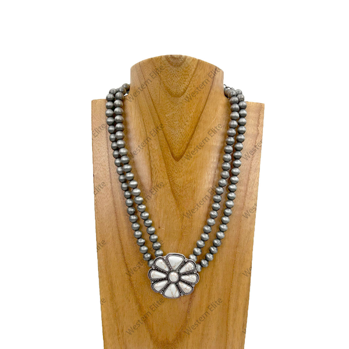 NKY240125-03-WHITE 17 inches double silver Navajo pearl beads chain with white stone flower concho pendent Necklace