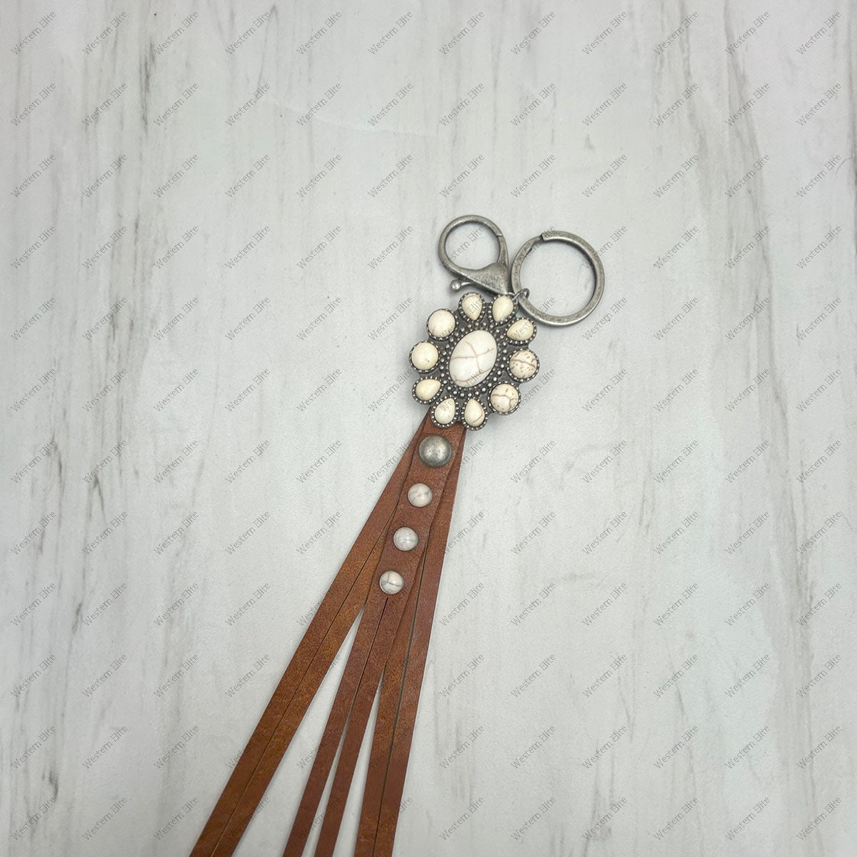 Silver metal and white stone with brown leather Key chain